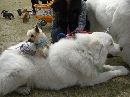 知人の方のピレニーズの上にケンシロー君が乗りました(笑)